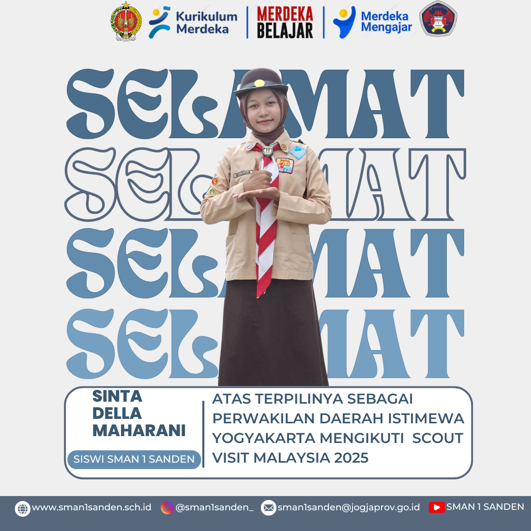 Selamat dan sukses atas terpilihnya siswa kami, SMAN 1 Sanden atas nama Sinta Della Maharani menjadi perwakilan dari DIY untuk Scout Malaysia 2025 ...